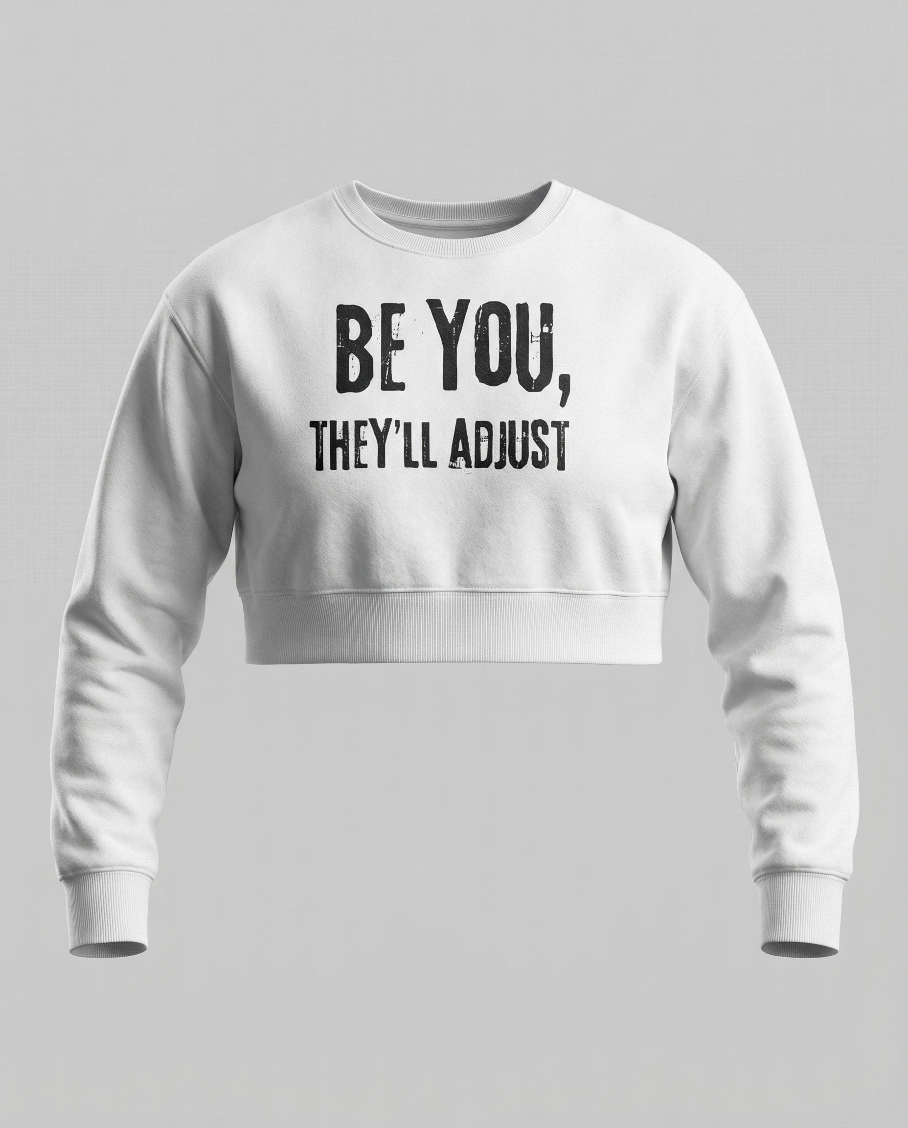 This cropped sweatshirt features a bold, black distressed-style text design that reads BE YOU, THEYLL ADJUST across the chest. The sweatshirt has a relaxed fit with a cropped length that falls just above the waist, offering a casual and comfortable look. The ribbed cuffs and hem provide a snug fit around the wrists and waistband, ensuring the garment stays in place.
