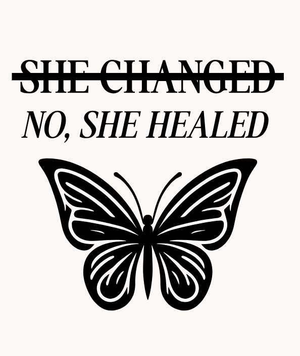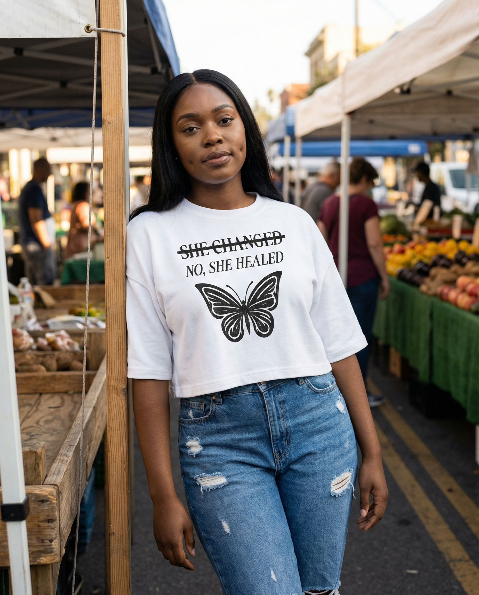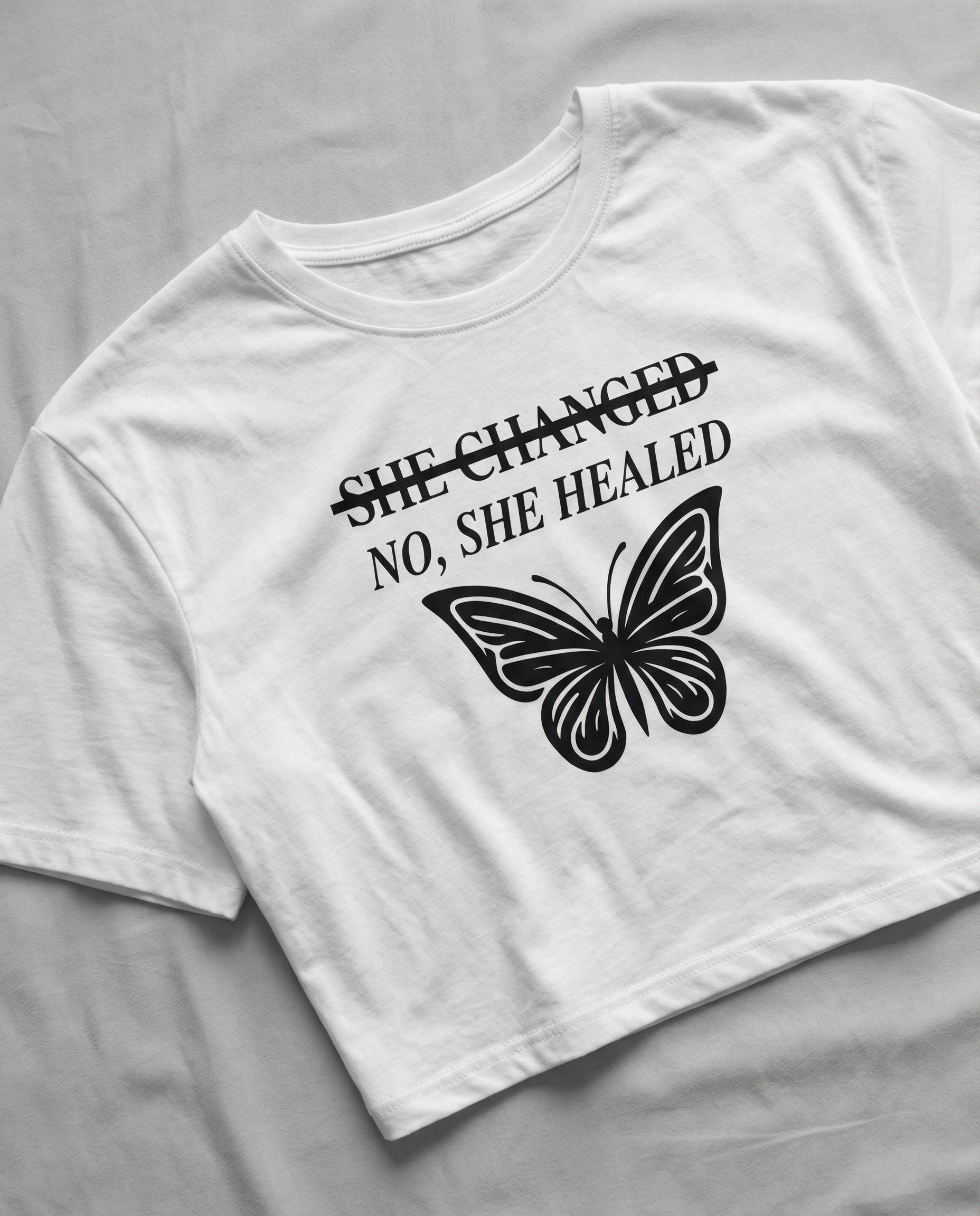 - She Changed, No, She Healed: printed above a striking black butterfly design. The relaxed fit offers a comfortable, loose silhouette with a slightly dropped shoulder and a longer hemline, perfect for a casual yet impactful look. The t-shirt is designed to be versatile, suitable for everyday wear or pairing with jeans, skirts, or leggings.