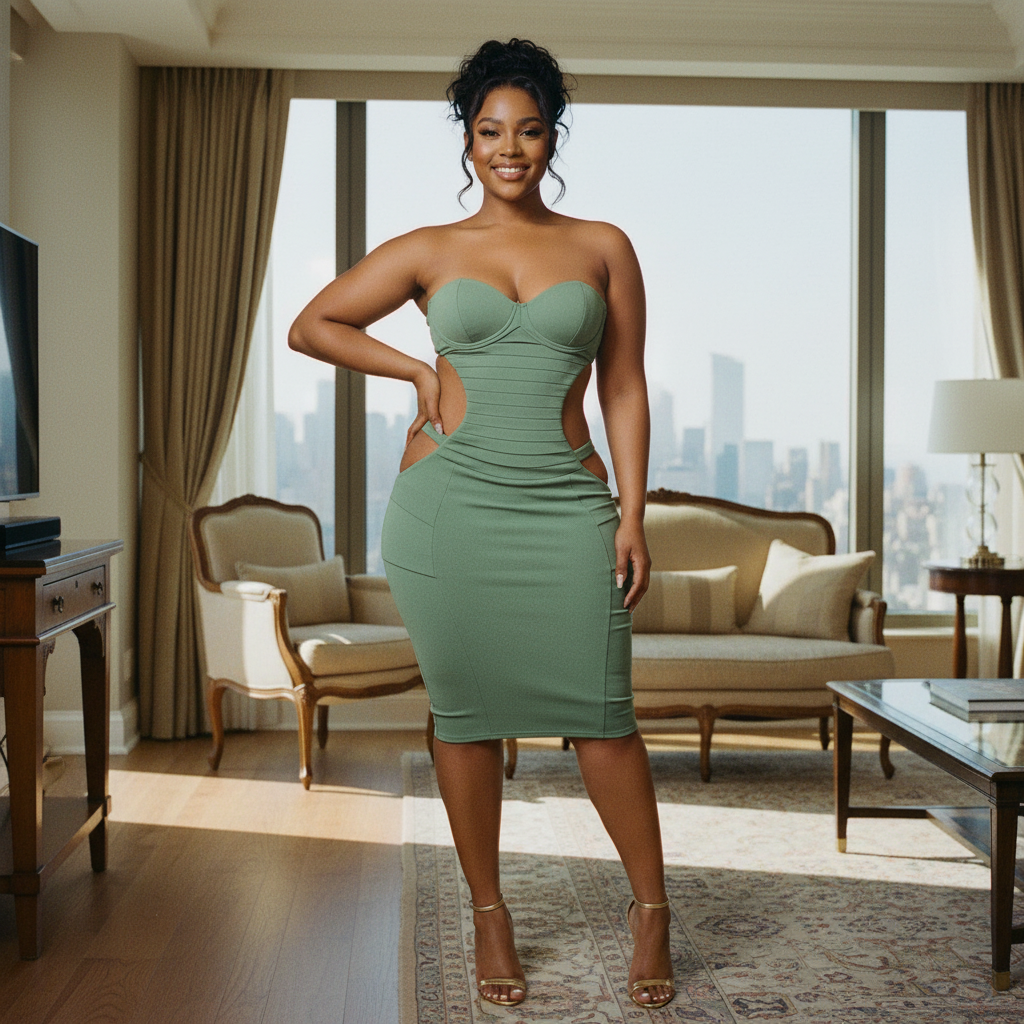 This dress is a form-fitting, knee-length bodycon style with a sweetheart neckline. It features a strapless design that hugs the body, accentuating curves.