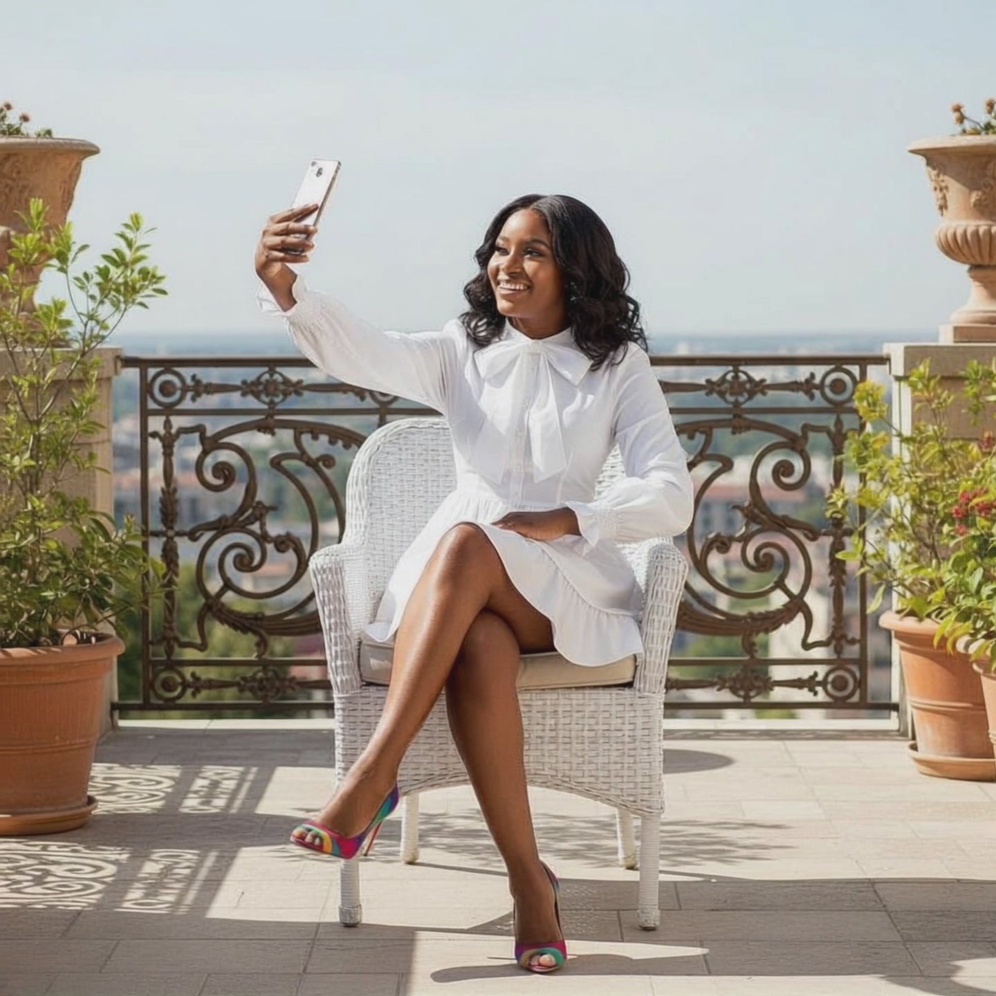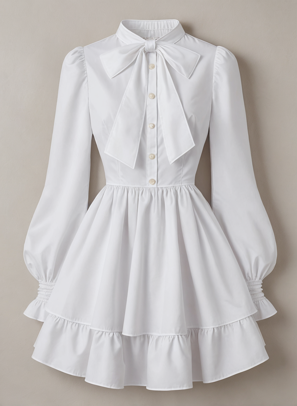 Elegant white mini dress featuring a bow tie neckline and ruffled long sleeves. Perfect for a stylish and sophisticated look.